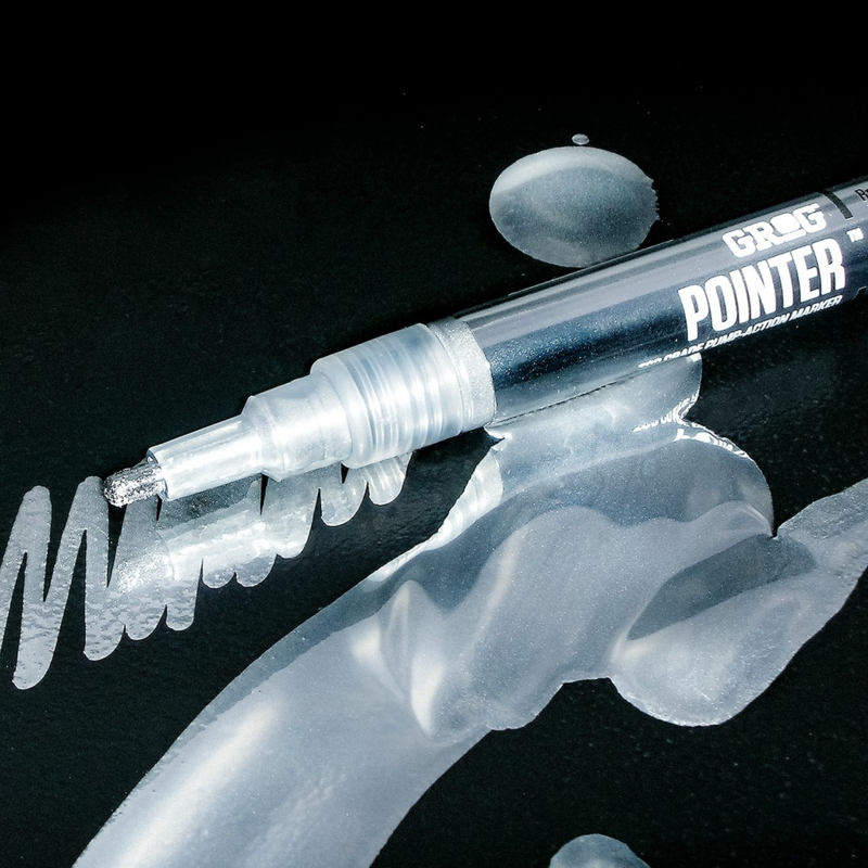 | Eigenschappen | De Grog Pointer 02 MCP combineert hoge precisie met een intens chroomeffect in een compact formaat. De marker is voorzien van een 2 mm ronde polyester punt, geschikt voor strak detailwerk en gecontroleerde lijnen. Gevuld met 8 ml Mercury Chrome Paint, een alcoholgebaseerde metallic verf met sterk spiegelend resultaat. Op gladde ondergronden ontstaat een duidelijk reflecterend chroomeffect. De slanke, stevige behuizing biedt goede grip en nauwkeurige controle. Geschikt voor stickers, schetsen, modelbouw en kleine tags. Hoe gladder het oppervlak, hoe sterker het spiegeleffect. |